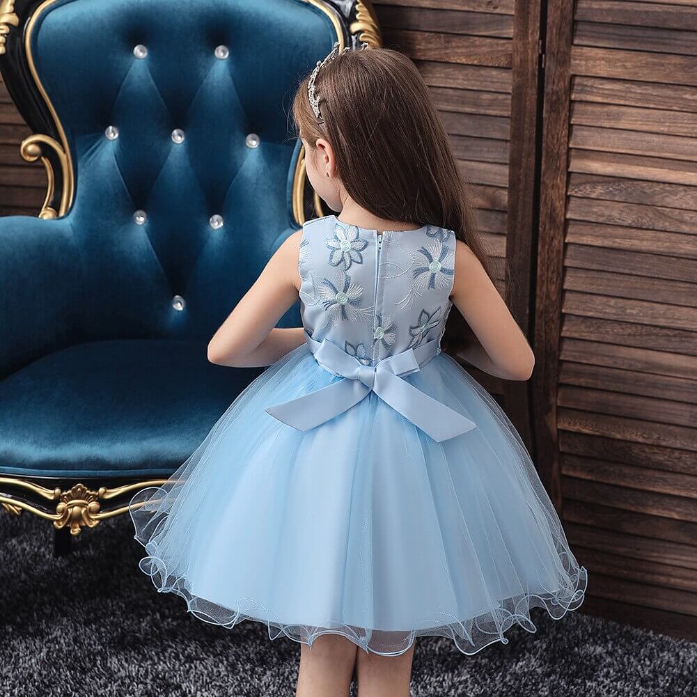 Sin mangas y adornado con bonitas flores a juego con el vestido azul, este traje formal podrá lucirlo en ceremonias, festividades como una fiesta de cumpleaños, o incluso en carnaval encarnando a su princesa favorita. Y para aún más fantasía, ¡no olvides consultar nuestro catálogo de zapatos y coronas!